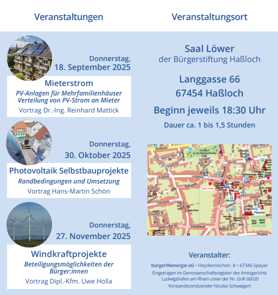 7.8.2025: Der Flyer zur Herbst-Veranstaltungsreihe der bINe in Haßloch (Mieterstrom, PV-Selbstbau, Windkraft) liegt vor.