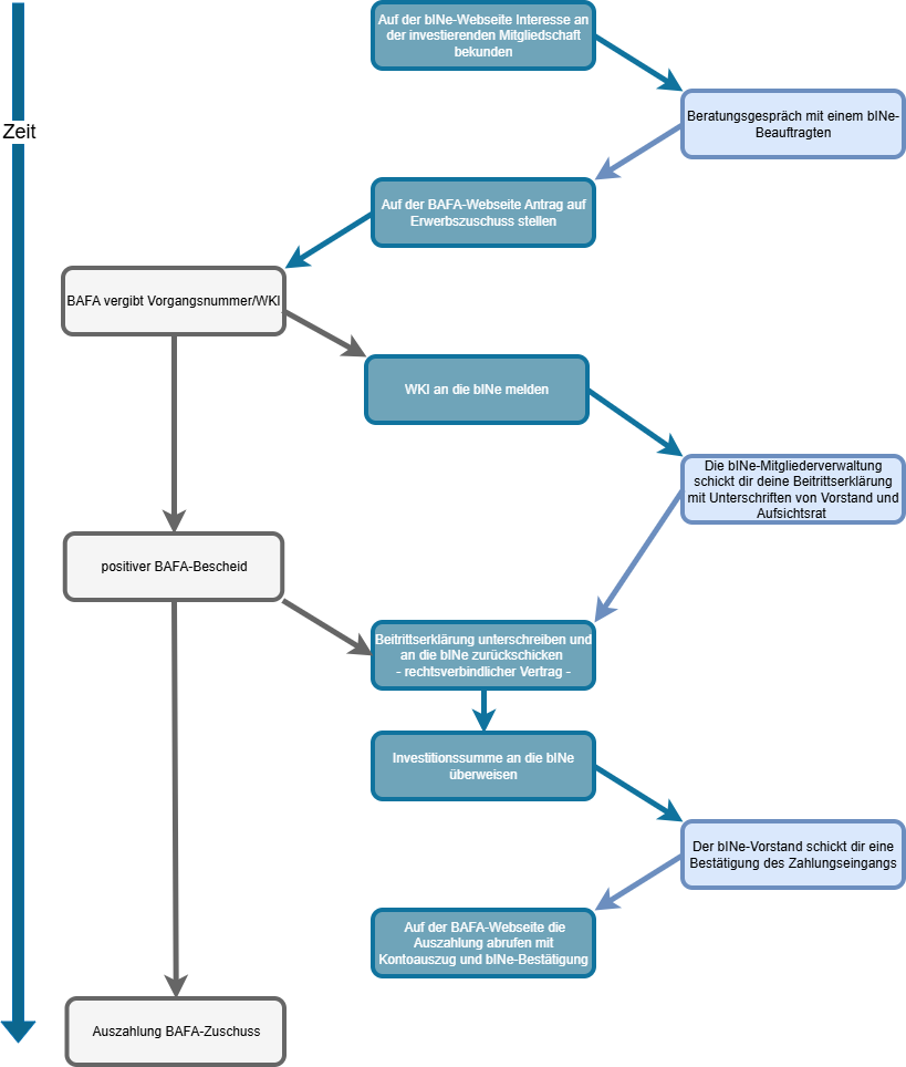 - Der bINe-Vorstand schickt dir nach Zahlungseingang eine „Erst-Invest-Bestätigung“ zur Vorlage beim Antrag auf Auszahlung des Erwerbszuschusses.